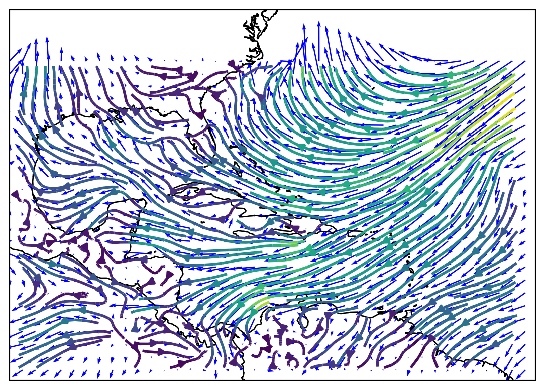 ax1.streamplot(lon, lat, U10, V10, transform=vec_crs,